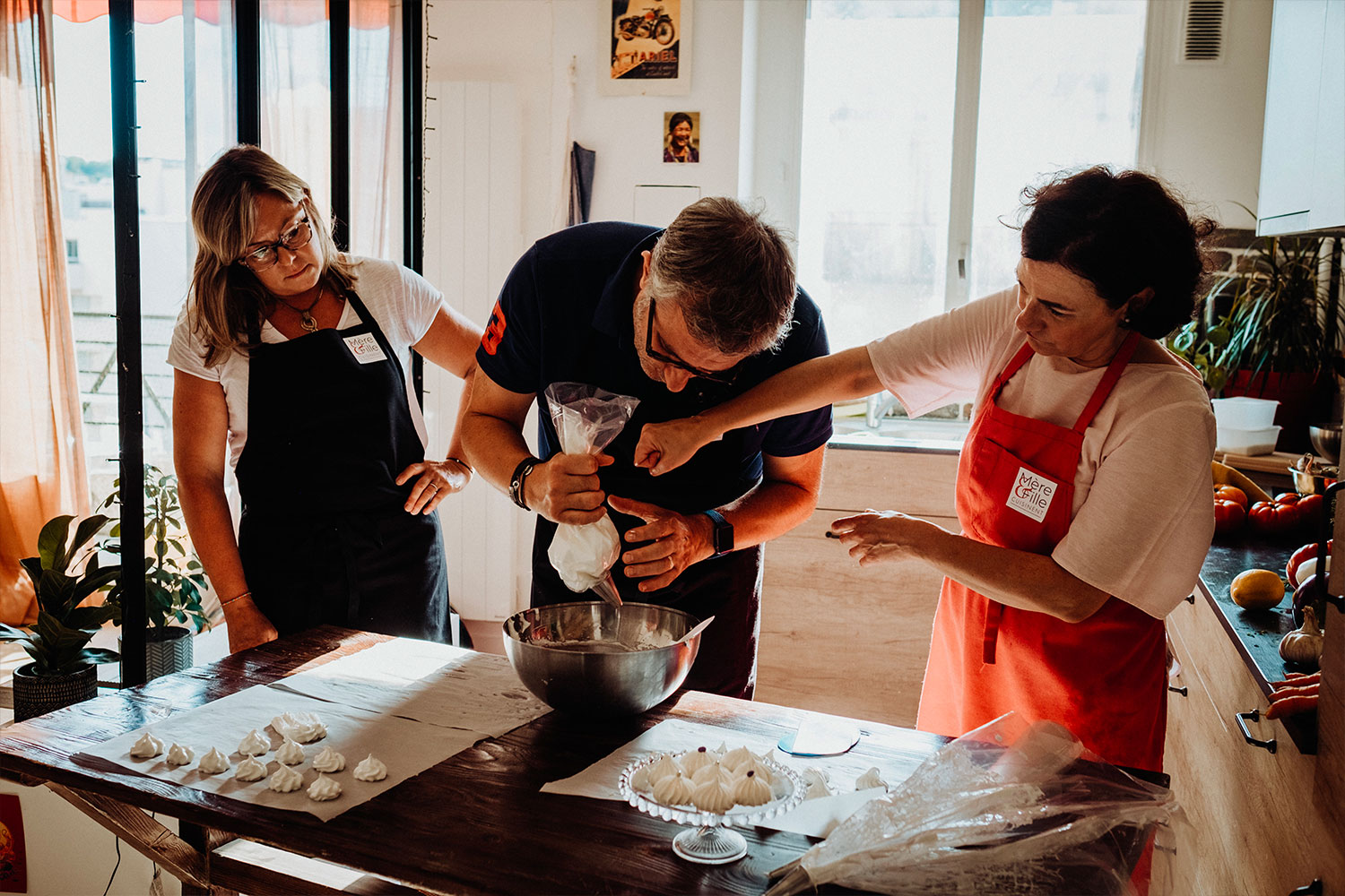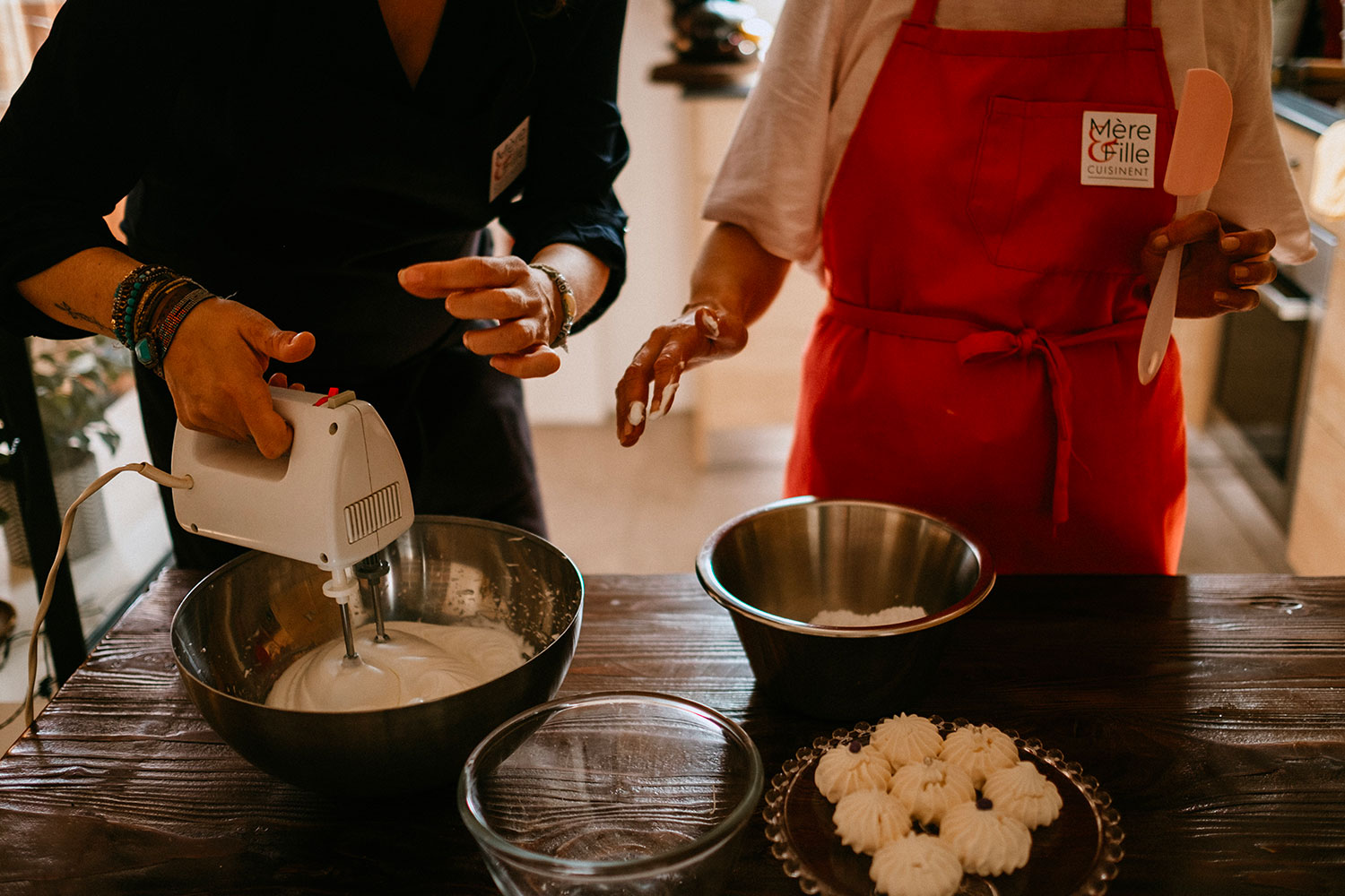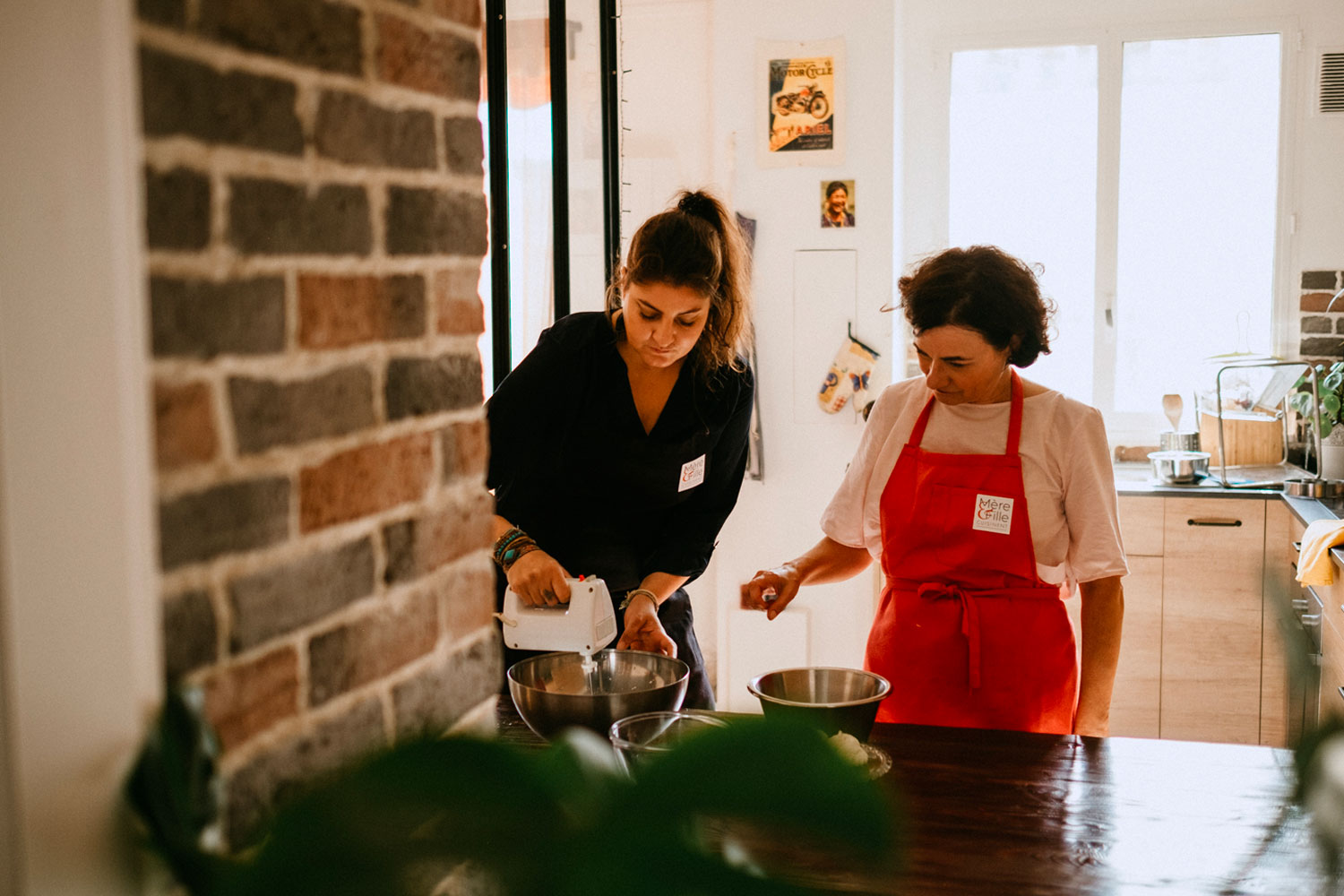 Mon arrière-grand-père et mon grand-père étaient glaciers-confiseurs. Ma mère a passé ses années de jeunesse au milieu des turbines de glaces. Moi, j’ai grandi dans les parfums quotidiens de la cuisine de ma mère. J’ai observé puis reproduit tous ses gestes, en l’écoutant me raconter comment on fabriquait du nougat ou de la glace plombière, spécialité de mon grand-père. Lorsque ma fille est née, tout cet héritage a ressurgi comme un trésor oublié. J’ai décidé alors d’obtenir mon CAP pâtisserie, pour devenir traiteur. C’est ainsi que ma fille est tombée à son tour dans la marmite. Elle m’a observée et a reproduit mes gestes, année après année. « Mère et Fille Cuisinent » est pour moi le moment venu de la transmission de ce qui me rend heureuse depuis toujours. Mes recettes sont simples. C’est la cuisine généreuse, familiale, amicale que j’ai apprise et que je partage avec vous. C’est aussi la cuisine que vous retrouverez dans mes ateliers.