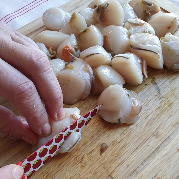 Passez les noix sous un filet d’eau fraiche pour enlever le sable. Séchez-les délicatement avec un papier absorbant. Au couteau, détachez le corail et la partie dure de la St Jacques. Otez aussi la membrane qui entoure la noix.